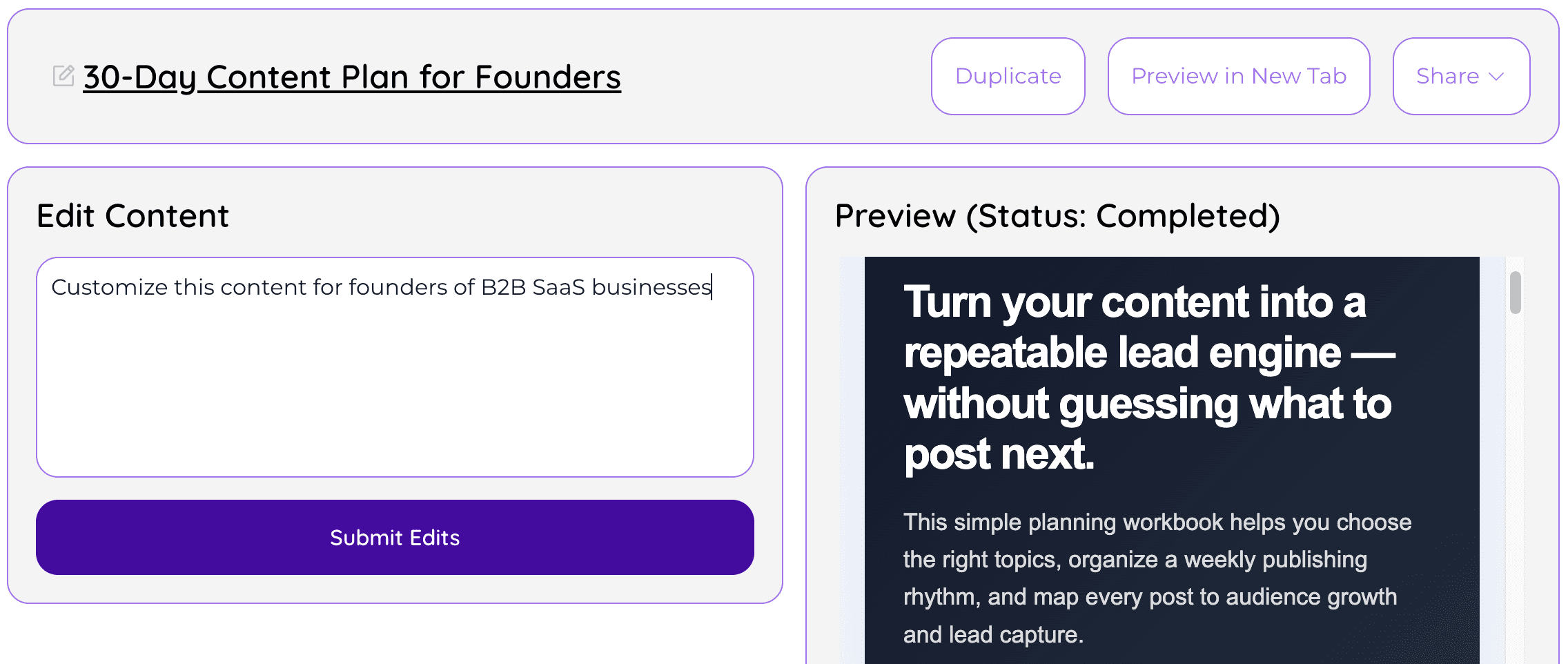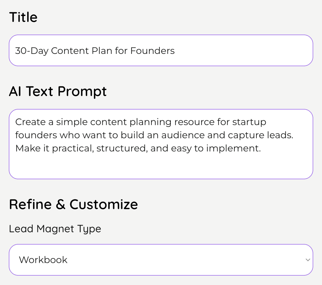 Start with a topic, audience, offer, or existing content. Just describe your idea and we'll take it from there.